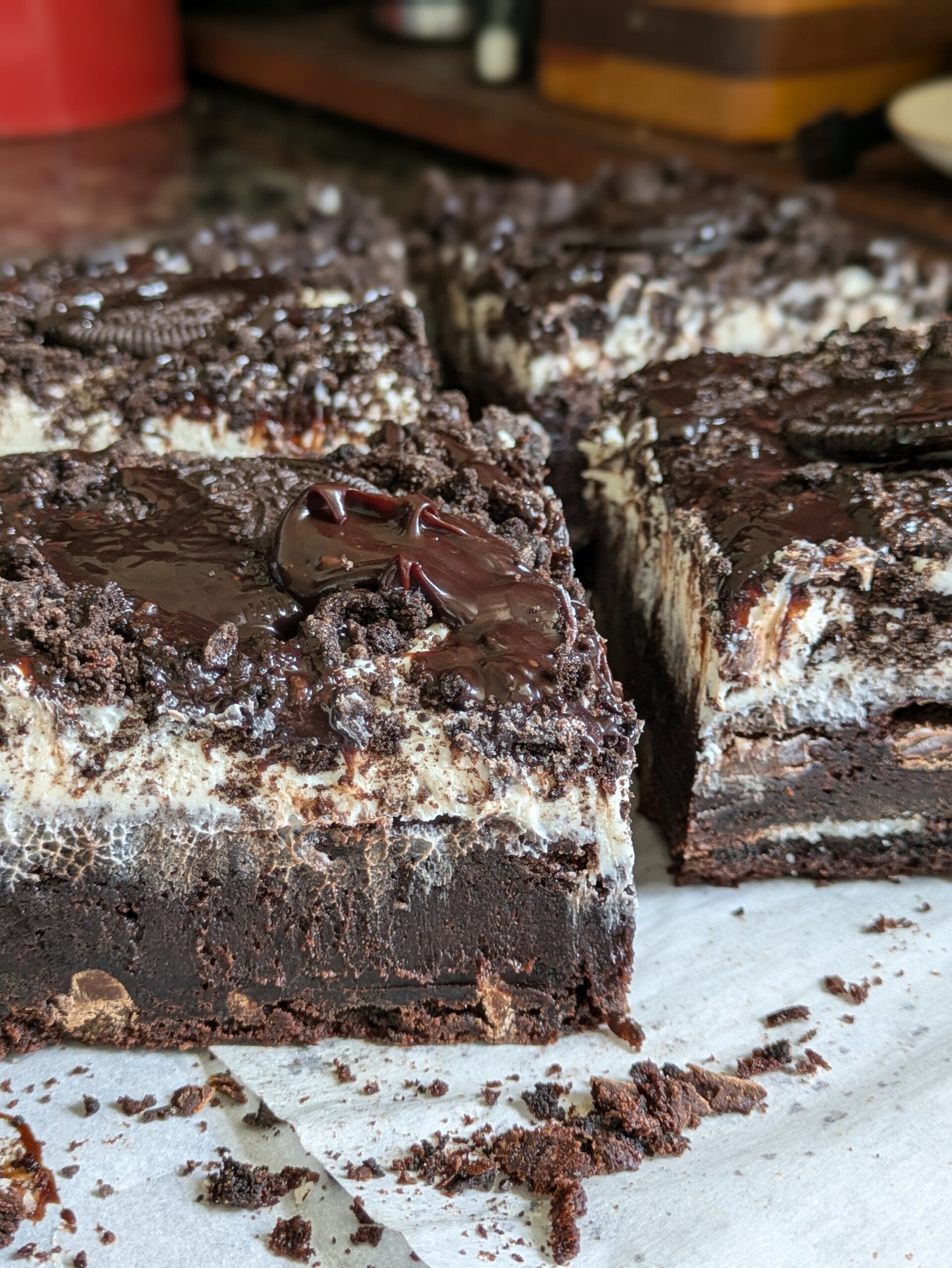 rich, fudgy brownies made from scratch using dutch cocoa and semi sweet chocolate. topped with homemade chocolate buttercream.