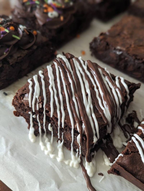 thick and fudgy dark chocolate brownies in a variety of flavors